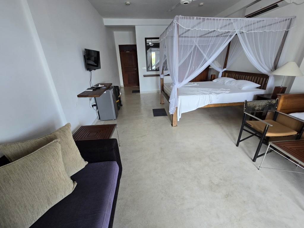 These rooms are on the bridge side of the building and have tree top views of surrounding gardens and buildings. You can sit on the balcony and enjoy watching the coming and going of people passing over the famous Bentota Bridge and river traffic passing under the bridge. These rooms also enjoy sunrise and views of the Bentota Udakotuwa Temple through the trees.